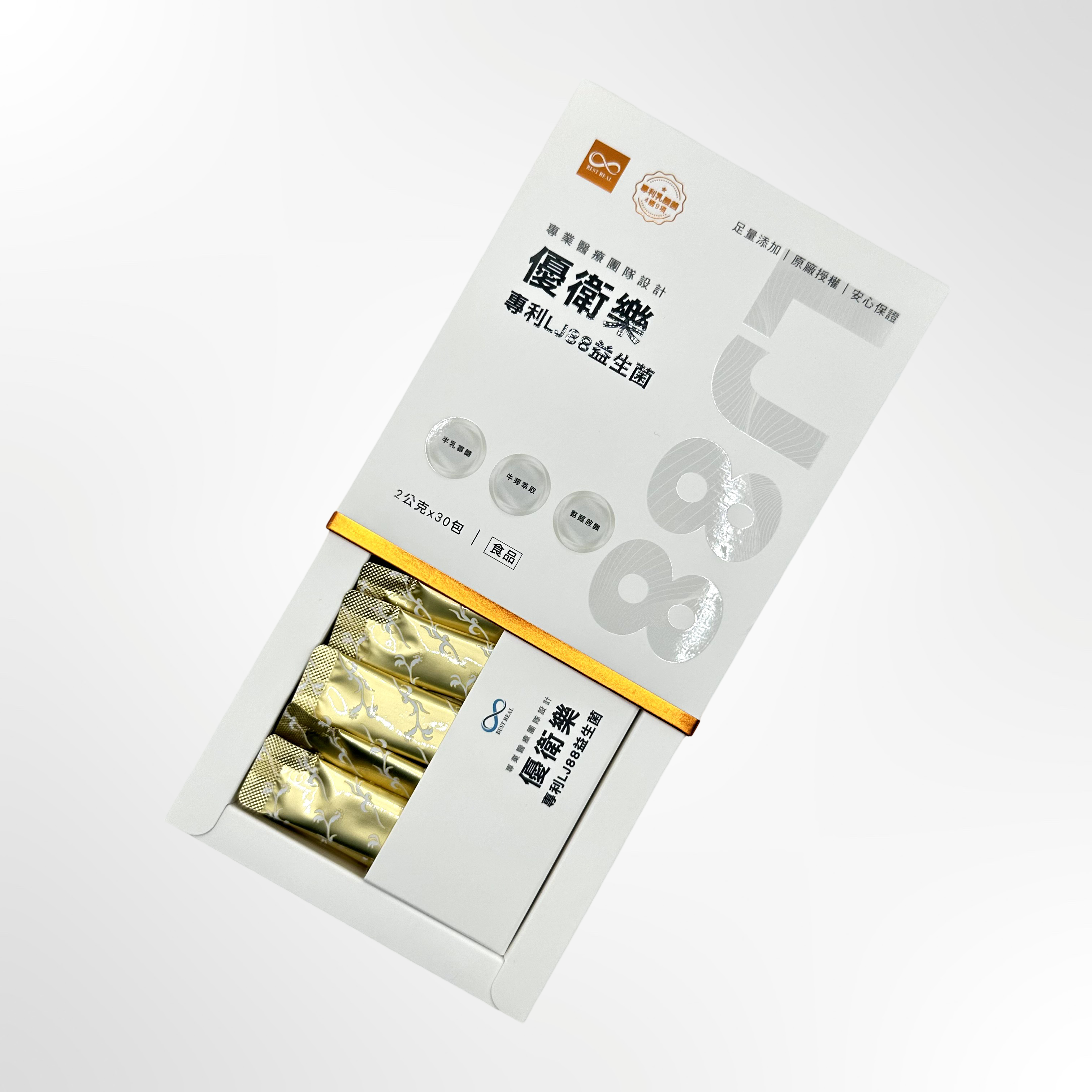 來自台灣的專業配方,每包含有益生菌 Lactobacillus johnsonii No.1088(LJ88),搭配優酪粉、半乳寡糖、專利牛蒡萃取物與麩醯胺酸,溫和協同補充日常所需。