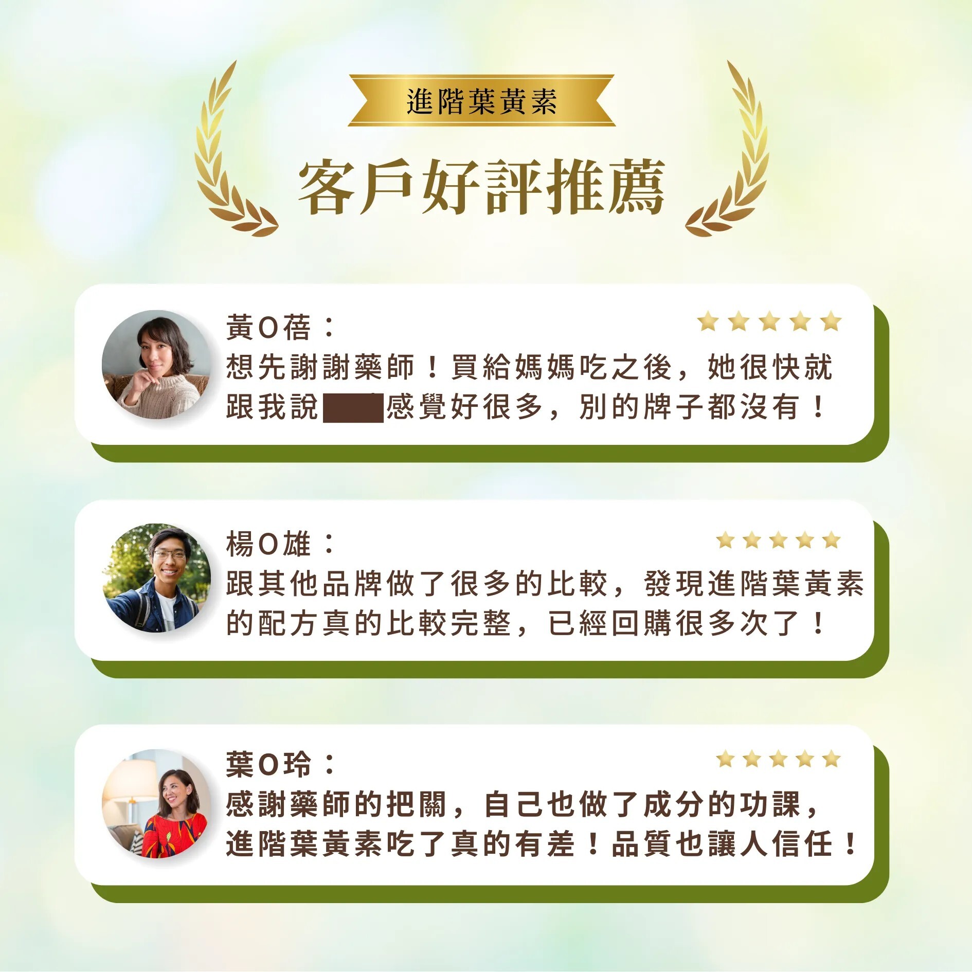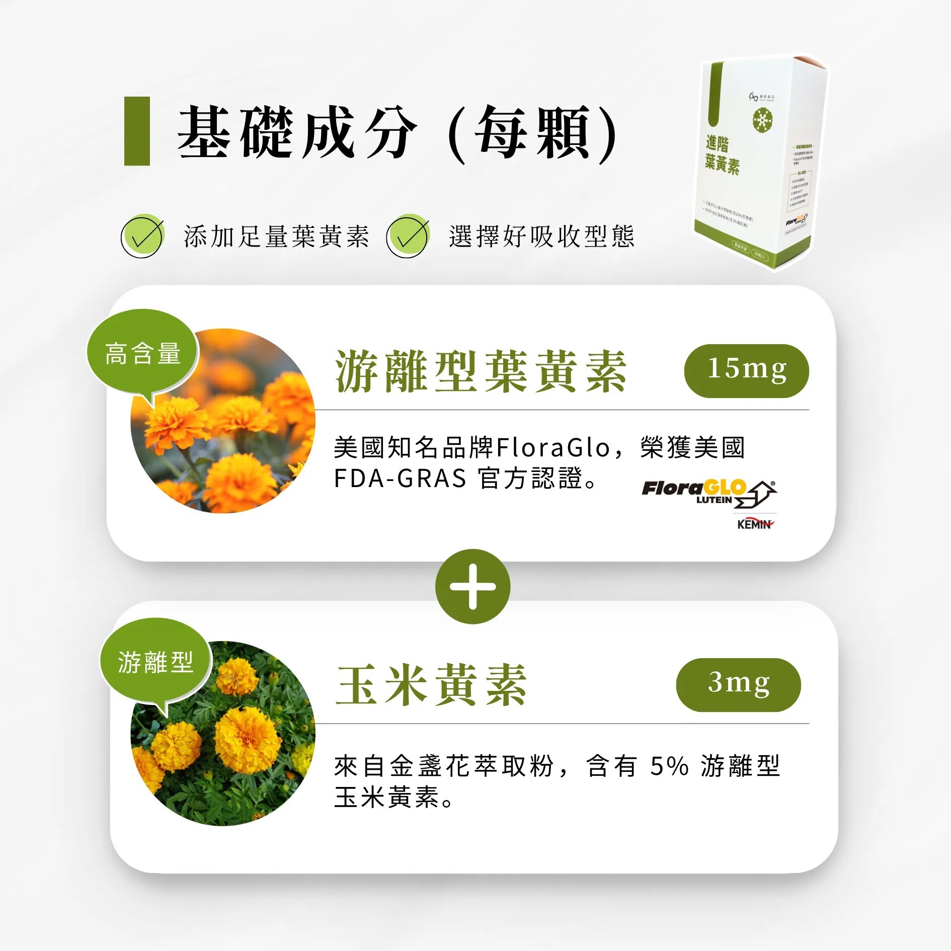 ▶ 每粒含游離型葉黃素15毫克,搭配玉米黃素3毫克,黃金比例配方